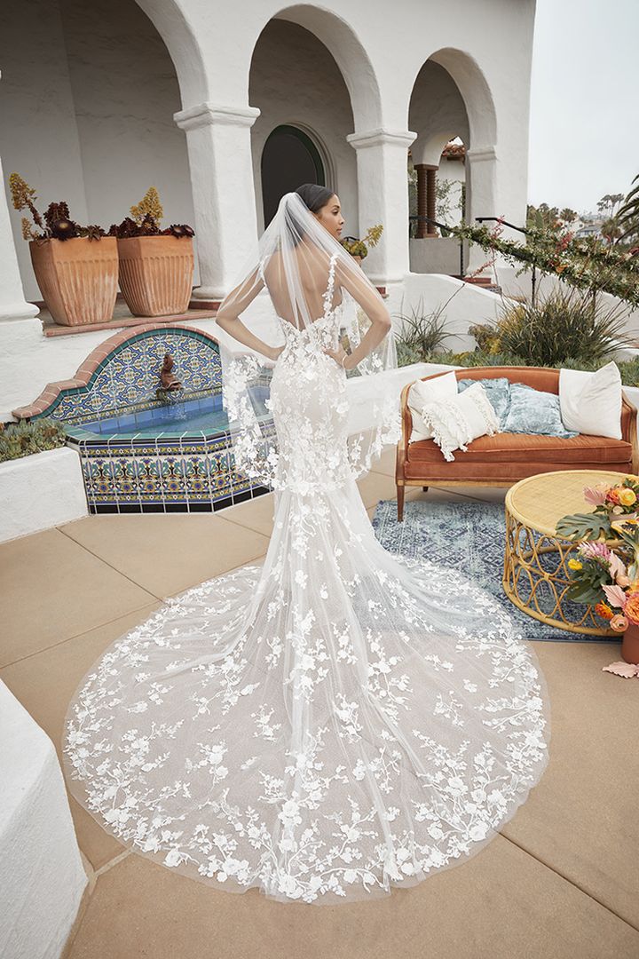 Lace tells the story of love with BL376 Grayson, the perfect wedding gown for the modern bride who’s looking for a touch of femininity and sensuality. The fit-and-flare silhouette is form-fitting and comfortable, decorated with a layer of sequined tulle underneath decorative lace appliques that bloom from head to toe. You’ll feel at your most magical in the V-neckline, complemented by sheer panels on the sides of the gown that transition into a sheer back. The beautiful 85 inch train and matching knee length veil is the cherry on top of this unforgettable wedding day look. Your spouse-to-be will be dreaming of this look for years to come.
