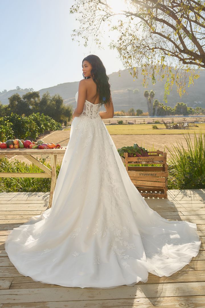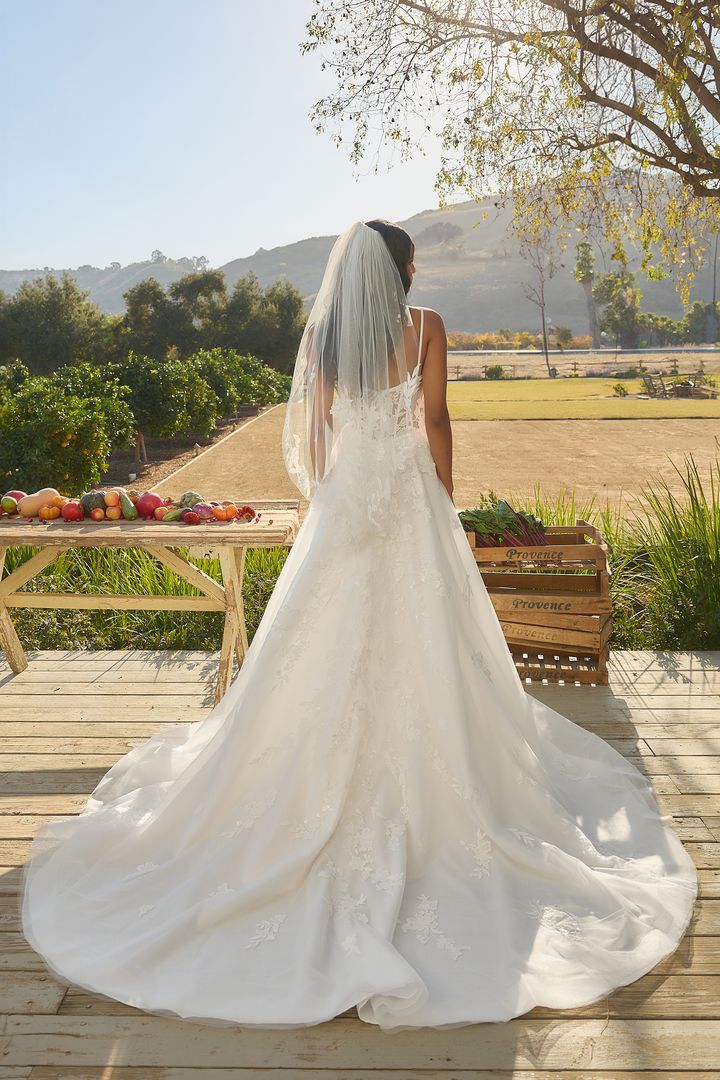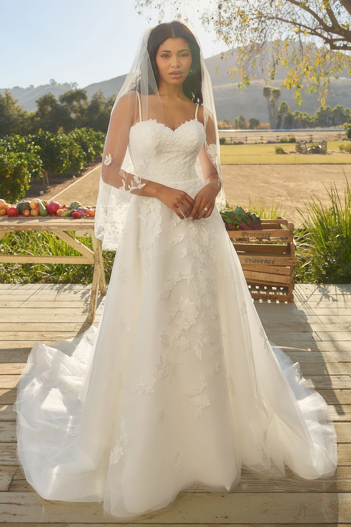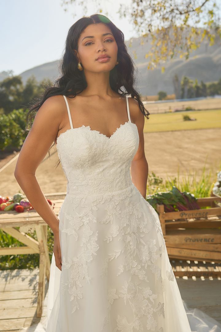 Crafted with tulle and intricate lace appliqués, the Missy gown features a structured, sweetheart bodice and removable spaghetti straps for a 2-in-1 bridal ensemble. Her A-line silhouette offers comfort and class. As the sunlight shines through the leaves, it reflects on her blooming, sequins lace details. The bodice is fully corseted for a flattering fit and features exposed boning in the back for a little peek of skin. Her sweeping 76-inch cathedral train paired with her matching fingertip veil (BL479V), offered separately, is a vision of grace. Her accessories can be worn on the shoulder or detached for a striking transformation from ceremony to reception.