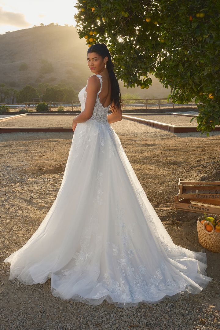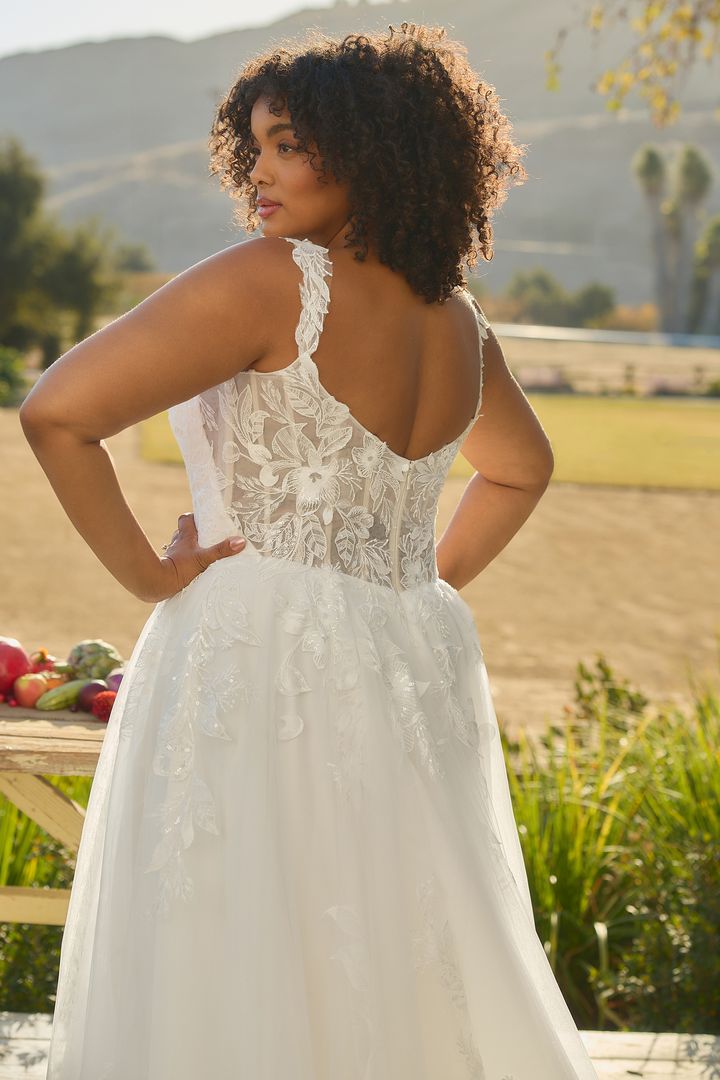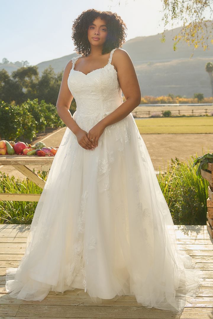 Glowing in the afternoon light, BL485-2 Hawthorn is soft, romantic, and ethereal. This A-line silhouette flows effortlessly, featuring a scalloped sweetheart neckline and delicate tank straps that frame the bodice with timeless beauty. Crafted from stretch lining and layers of airy tulle, the gown is adorned with sequin lace appliqués, adding a shimmer that catches the sunlight with every move. A zipper closure at the back ensures a seamless, structured fit, while the flowing skirt brings sweeping drama to the silhouette. Perfect for the bride seeking a gown that feels as natural and radiant as the setting around her. Pair Hawthorne with her matching cathedral veil to extend her train from 60 to 85-inches, BL485V offered separately.