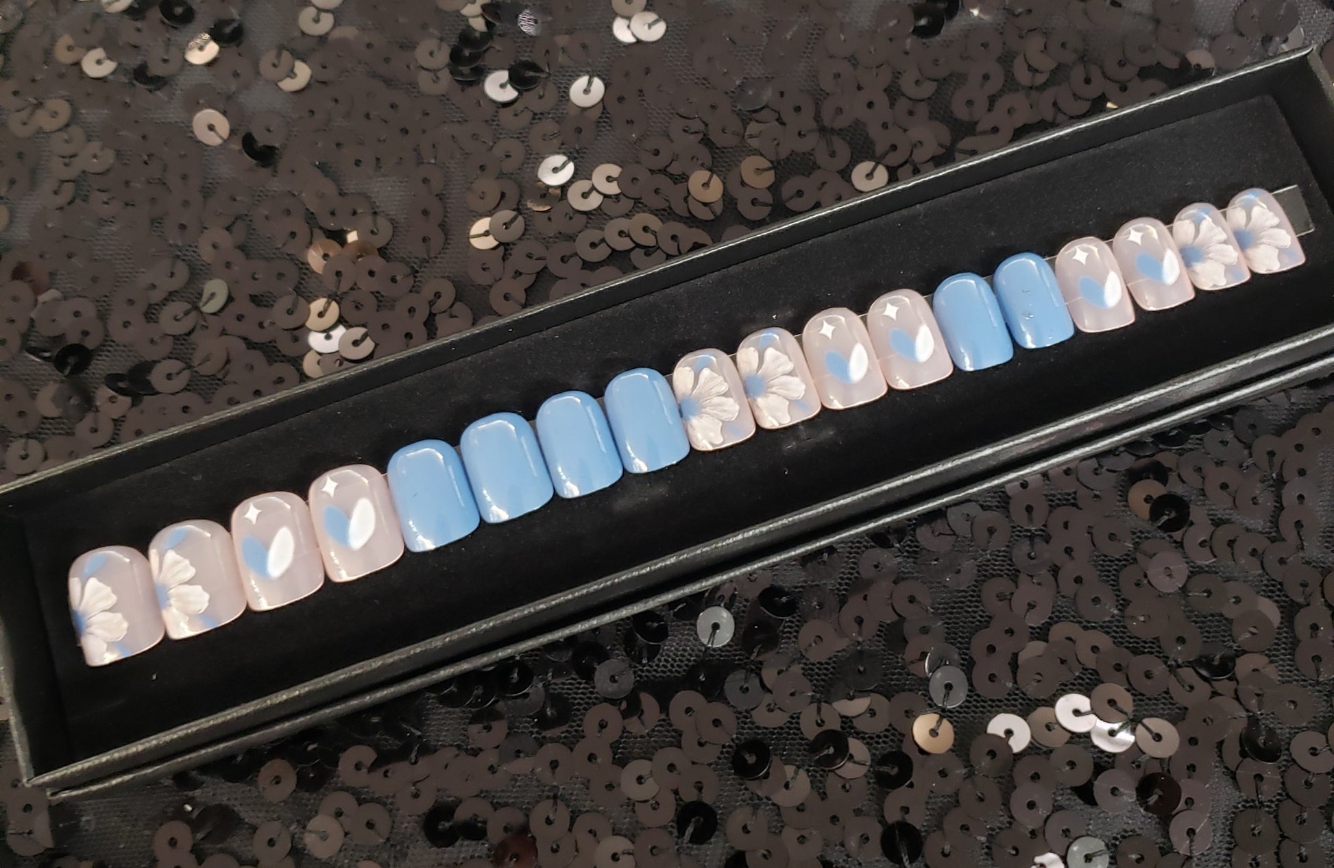 Nails are packaged in a black gift box and include: