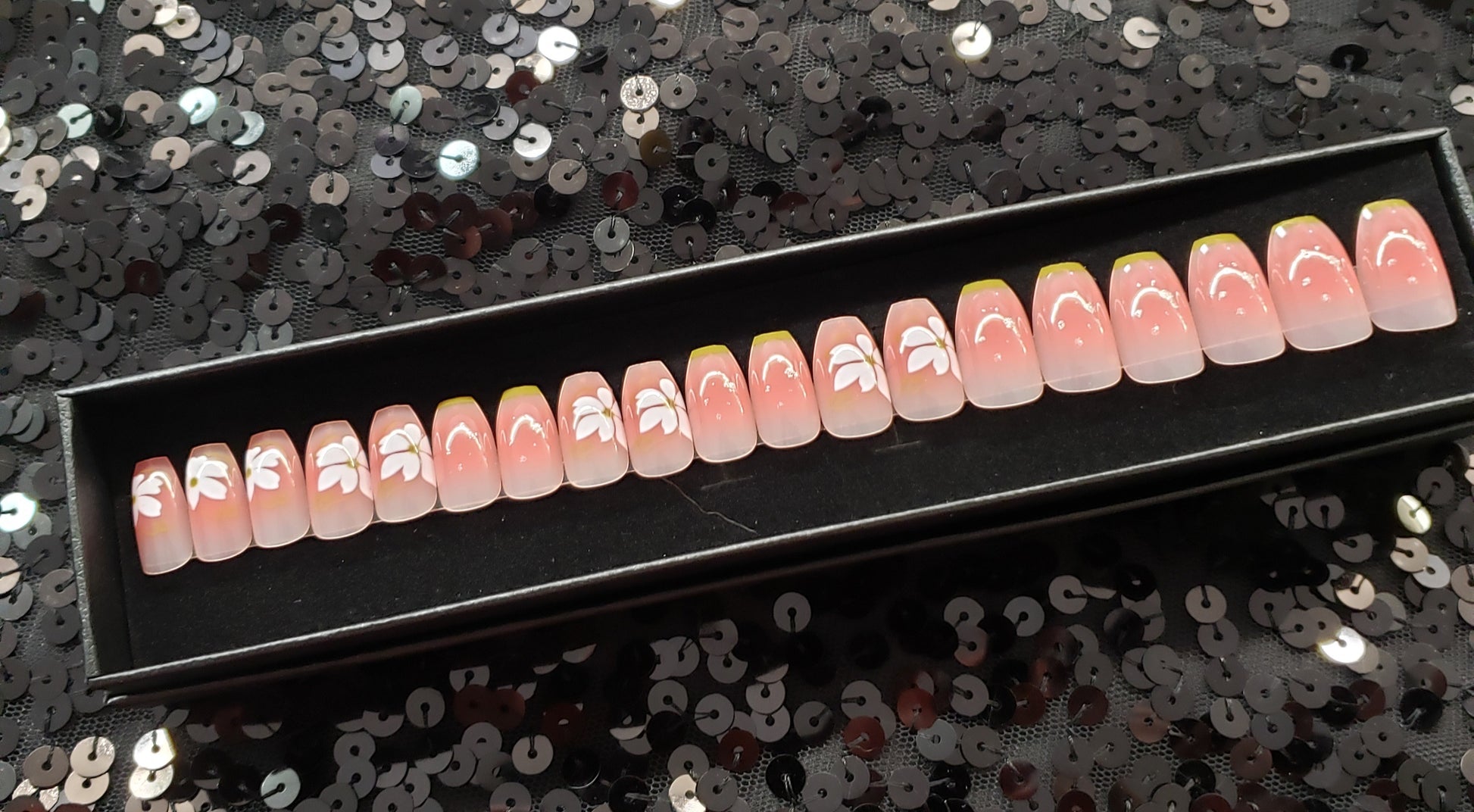 Nails are packaged in a black gift box and include: