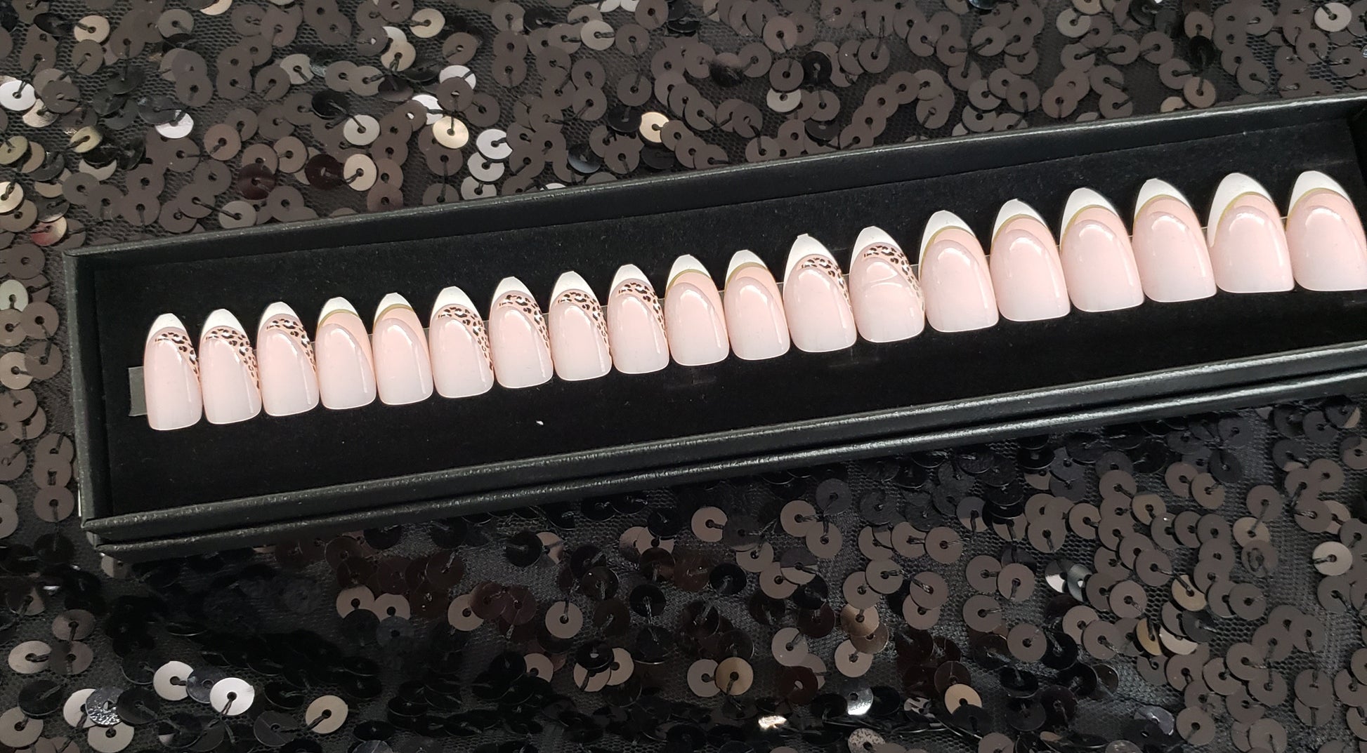 Nails are packaged in a black gift box and include: