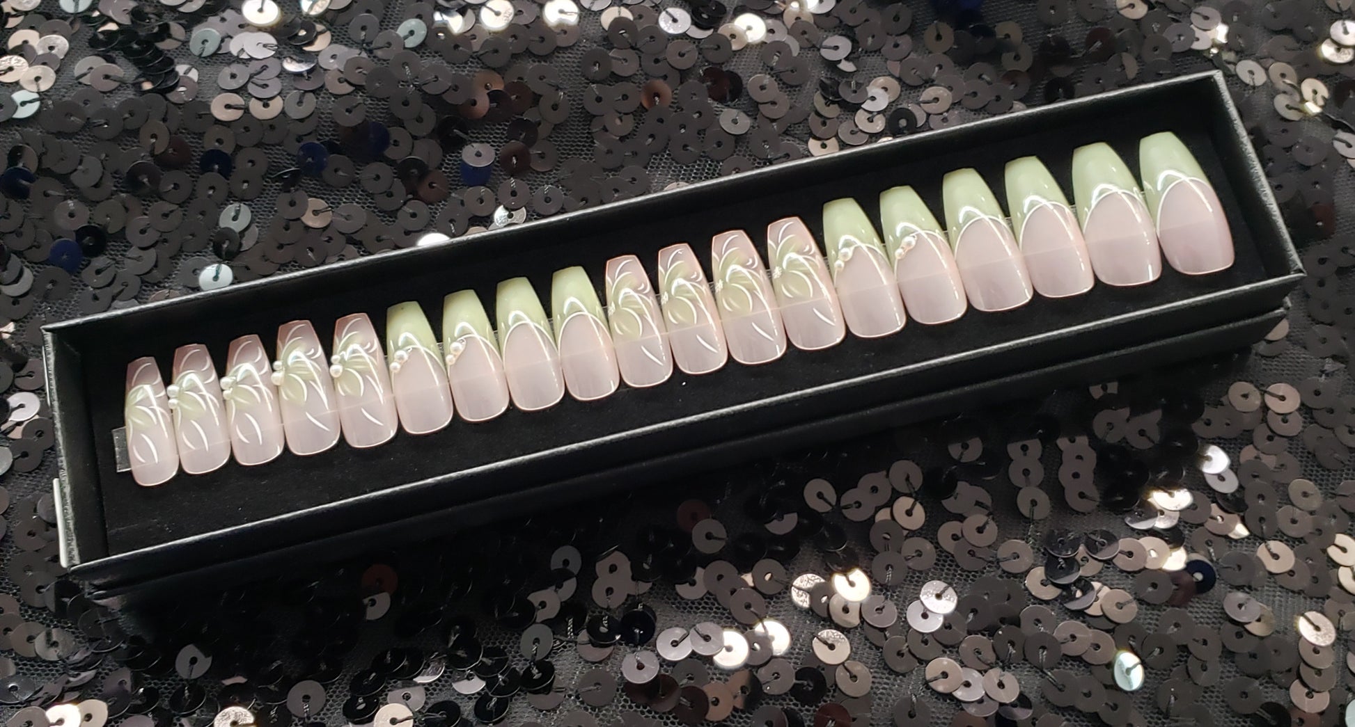 Nails are packaged in a black gift box and include: