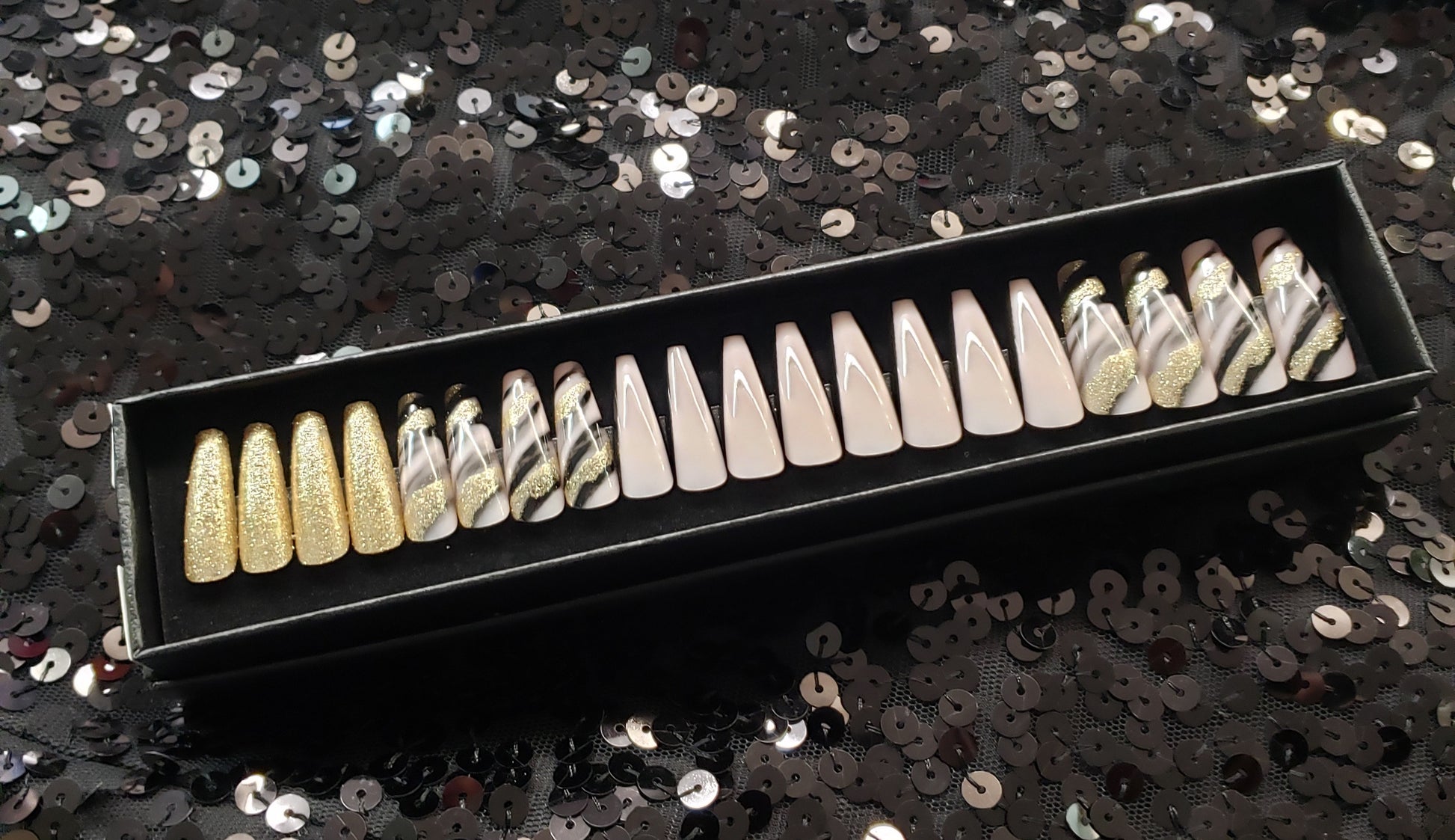 Nails are packaged in a black gift box and include: