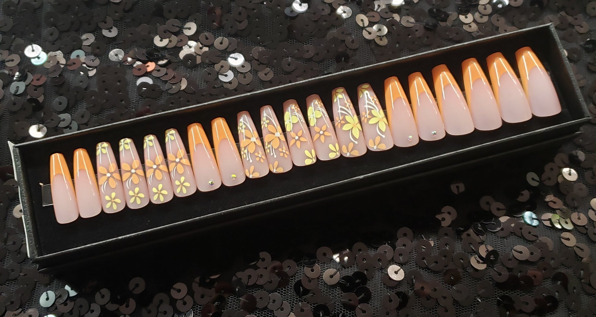 Nails are packaged in a black gift box and include: