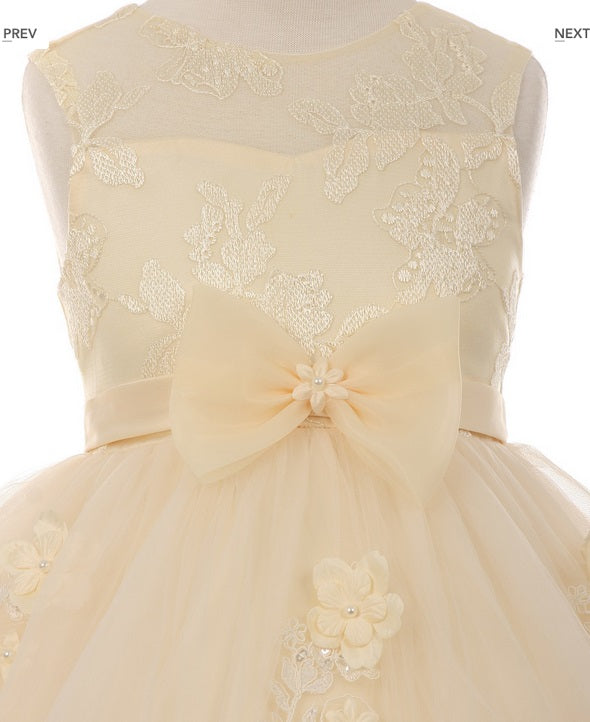 Gorgeous high low flowergirl dress with floral design and bow accent at waistline