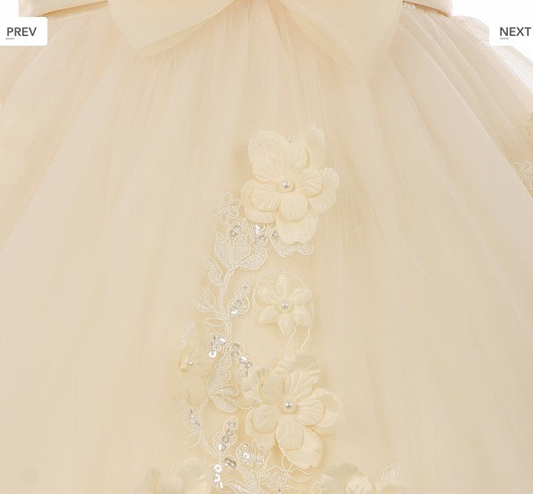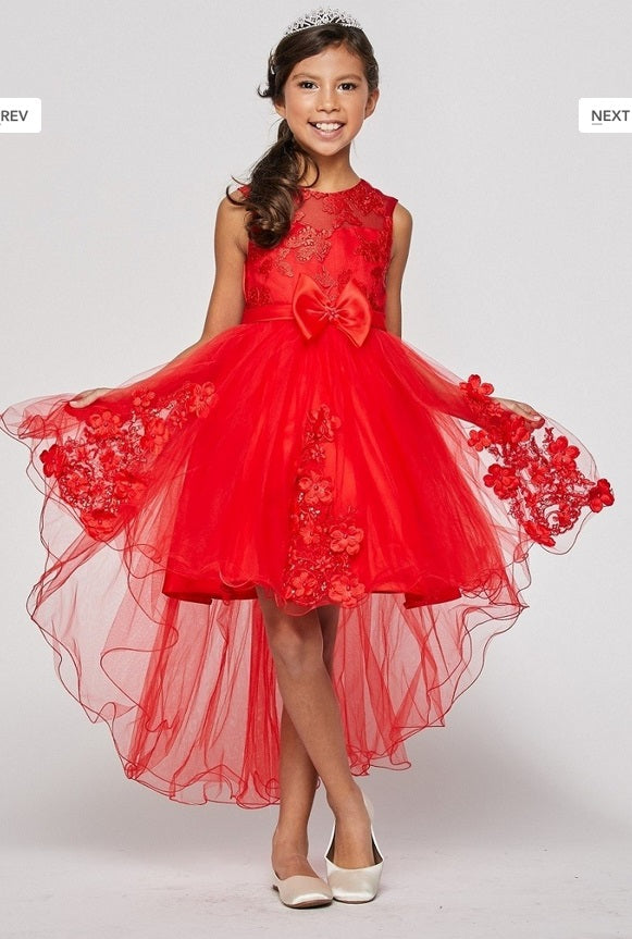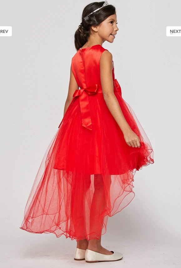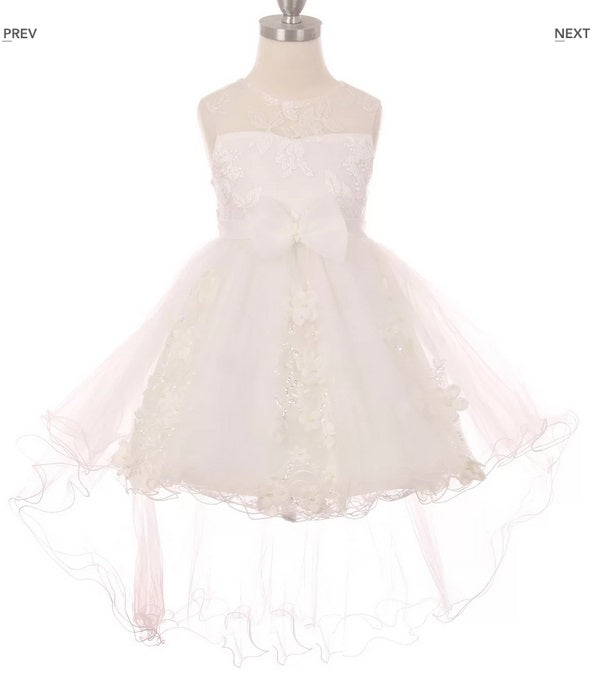 Gorgeous high low flowergirl dress with floral design and bow accent at waistline