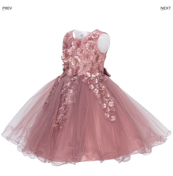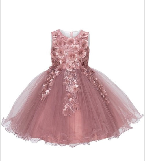 Elegant flower girl multi layered tulle dress with hand crafted two tone 3D flowers